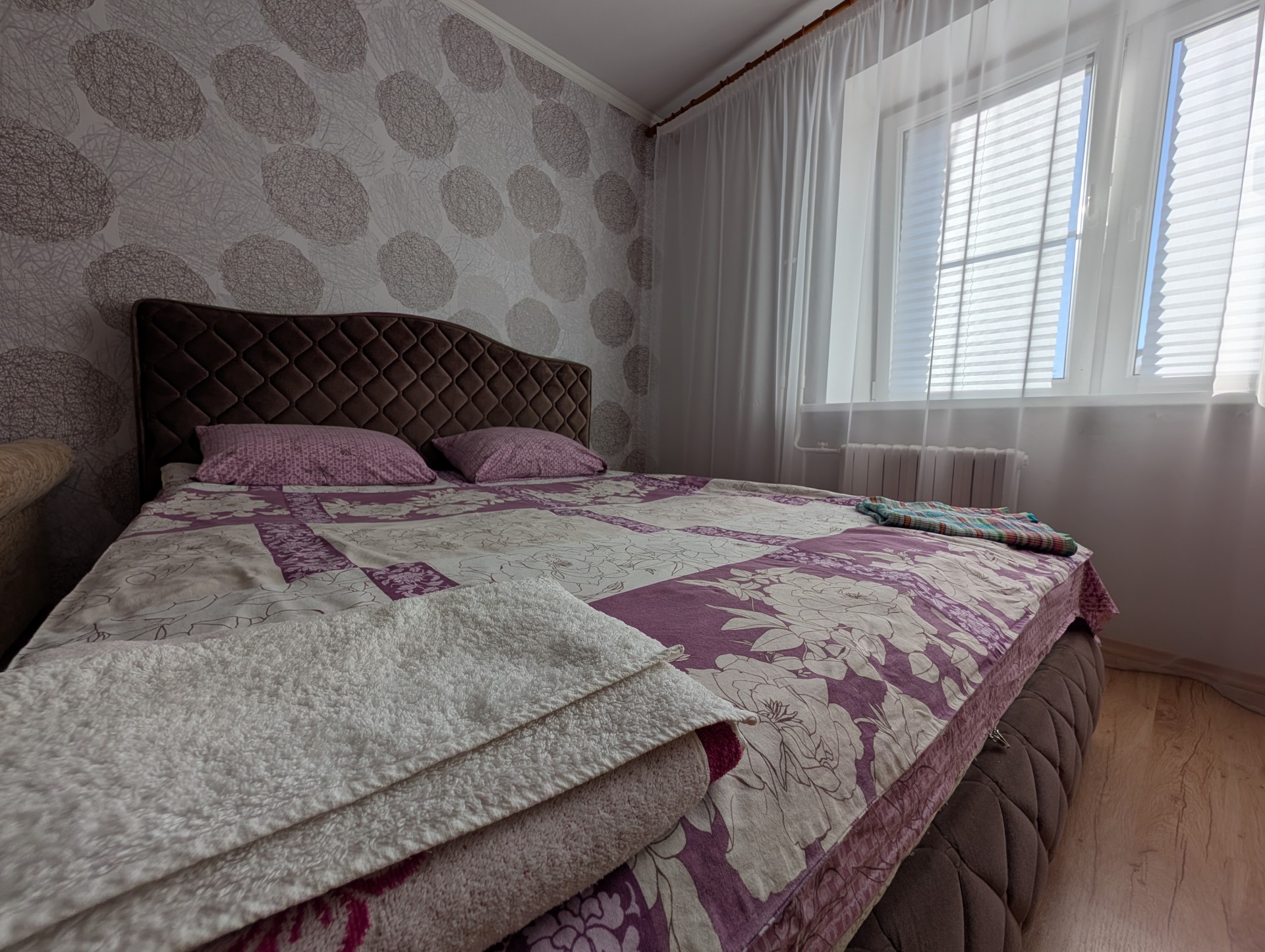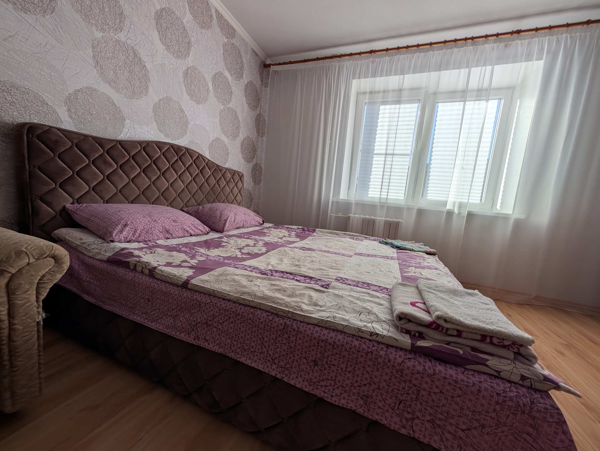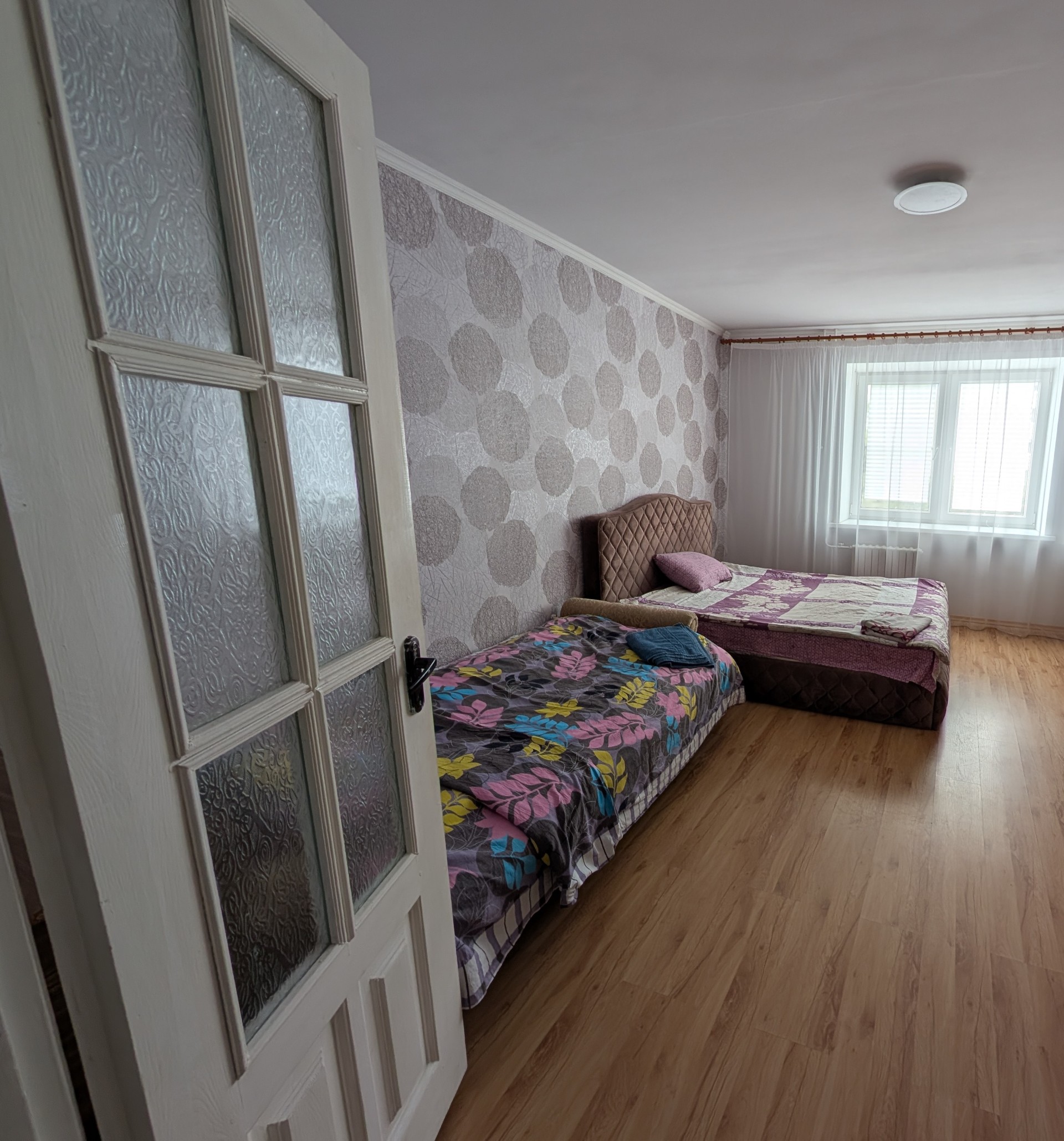 По спальным местам двуспальная кровать + раскладывающийся диван , Wi-Fi , ТВ, постельное белье , бытовая техника, есть все необходимое для комфортного проживания, в шаговой доступности парк, 2 магазина.